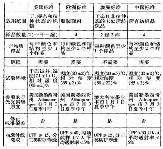 对于具有遮完性能面料品的规定,美国和澳洲标准为UPF值≥15,欧洲标准UPF值>40(UVA透射率<5%),中国标准UPF 值>30(UVA透射率< 5%),uV Standard 801则未作要求。美国和澳洲标准虽然都将遮完产品的小UPF值定为15,但测试样品却因是否经预处理而存在很大不同,故二者没有可比性。世界各国 对遮完面料品的判定标准有明显不同,测试方法也不完相同(见表2)。