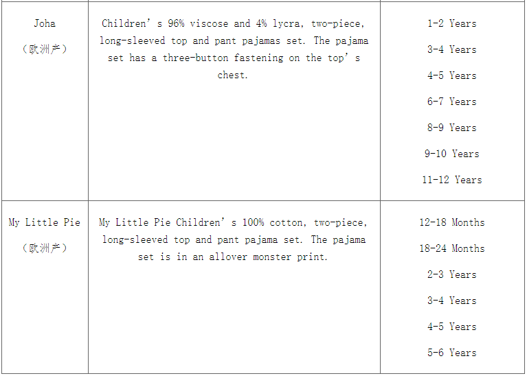 此次召回产品为5款儿童睡衣。具体召回产品信息如下: