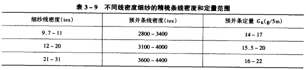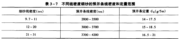 3.预并条线密度、牵伸倍数和并合数 一般6~8根并合,相应取6—8倍左右牵伸倍数,并合数增加可提高小卷中纤维的伸直度和平行度,改善精梳条质量,减少精梳落棉率。不同纱特细纱的预并条线密度和定量见表3—7。