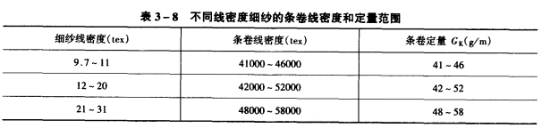 条卷机的并合数为20~24根,并卷机的并合数为6,条并卷机的并合数为30—48根。小卷线密度和定量范围见表3—8。