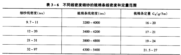 化学纤维抱合力较差,为防止纤维网漂浮,在纺制化学纤维时,纤维条线密度应较纯棉条的线密度大些,不同线密度细纱的梳棉条线密度和定量范围见表3—6。