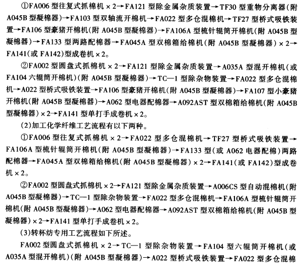 (2)合理配置棉箱机械,为使各种不同成分的原料混合良好,并使棉层纵横向结构均匀或输出均匀的纤维流,在进行单机组合时,必须交替安排2—3台的棉箱机械。