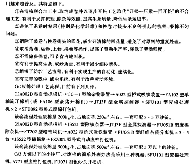 1、贯彻“多包细抓、多仓混合、成分正确、多松少打、先松后打、松打交替、早落少碎、杂除两头(粗杂、微尘及粘附性杂质)、清梳联结、多项自动、防火防爆、棉卷均匀、结构良好”等工艺原则。转杯纺纱中更应注意“多除硬杂和微尘,开松细致”等工艺要求。