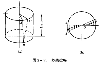 若把纱线截面看作是圆形,则处在不同半径处的纤维与纱线轴向的夹角是不同的,为了表示这种情况,引进捻幅这一指标。捻幅是指纱条截面上的一点在单位长度内转过的弧长,如图2—11(a)所示,原来平行于纱轴的AB倾斜成A'B,当L为单位长度时,则弧长AA'为A点的捻幅。如用PA表示A点的捻幅,β为∠ABA'为A'B与纱轴的夹角,则: