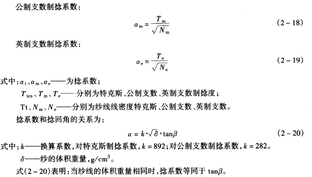 捻度测量较方便,但不能用来表达不同粗细纱线的加捻程度。为了比较不同线密度纱线的加捻程度,人们定义了一个结合线密度表示加捻程度的相对指标——捻系数。
