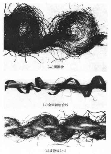 花式线:用特殊工艺制成,具有特种外观形态与色彩的纱线,包括花色线和花饰线。是由芯纱、饰纱和固纱在花色捻线机上加捻形成,表面具有纤维结、竹节、环圈、辫子、螺旋、波浪等特殊外观形态或颜色。