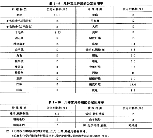 重量是贸易计价和成本核算时的重要依据,回潮率不同,重量就不同。而在贸易和成本计算中纺织材料并不处于标难状态。即使是在标准状态下同一种纤维材料的实际回潮率也不是一个常量。为了计重和核价的需要,就必须对各种纤维材料及其制品人为规定一个标准值,这个标准值称之为公定回潮率,应该注意:公定回潮率的值是纯届为了工作方便而人为选定的,它接近于标准状态下回潮率的平均值,但不是标准大气中的回潮率。各国对于纺织材料公定回潮率的规定往往根据自己的实际情况来制订,所以并不一致,但差异不大,而且还会修订。我国常见纤维和纱线的公定回潮率如表1—9、表1—10所示。