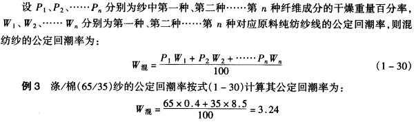 由几种纤维混纺而成的纤维条或纱线的公定回潮率,可以通过混合比例加权平均计算获得。下面以混纺纱为例来说明。