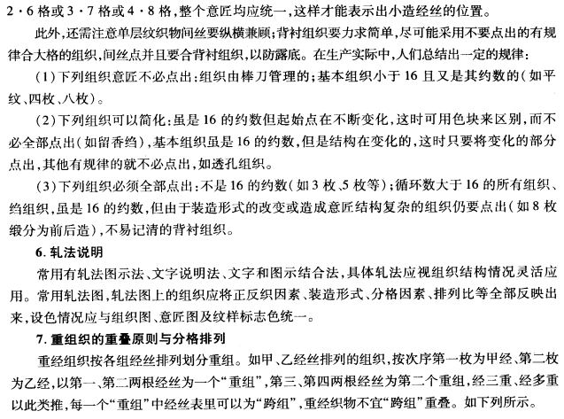 您现在的位置是:首页>复合面料资讯 复合面料资讯 纹制设计步骤 城南二哥2022-12-07 18:34:20复合面料资讯811来源:复合布料_复合面料网 纹制设计的内容包括绘画意匠和轧制纹板等工作,并确定经纬组合及排列、经纬密度、梭箱排列、装造类型、纹针数及意匠绘画要点、纹针样卡等,此外,还要画意匠片断图、纹板轧法图、目板穿法示意图等。 片断图要能反映设计的各种组织所支配的图案特点,根据经纬密度和纹样块面的大小来画意匠纹样的局部,这样可体现意匠的真实性,意匠片断图中还应反应如何匀边、间丝如何点法。 AAAWQ32RDRGFJ 发布的有些文章部分内容来源于互联网。如有侵权,请联系我们,会尽快删除。本文仅代表作者观点,不代表本站立场。 本文地址:https://www.tpu-ptfe.com/post/12925.html 上一篇:绉类丝织物设计 下一篇:轧花生产对棉结含量的影响 相关文章 中效袋式空气过滤器在HVAC系统中的高效应用分析 中效袋式空气过滤器对室内空气质量的提升效果研究 中效袋式空气过滤器在制药洁净室中的关键作用 中效袋式空气过滤器阻力特性与能耗关系探讨 中效袋式空气过滤器在数据中心空调系统中的部署实践 中效袋式空气过滤器容尘量与使用寿命优化策略 中效袋式空气过滤器在食品加工车间空气净化中的应用 中效袋式空气过滤器结构设计对过滤效率的影响