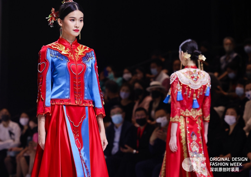 据了解,品牌所掌握的中式嫁衣(乔氏)制作技艺、湘绣技艺被收录于福田区第八批非物质文化遗产代表项目名录中,并于去年获得“湾区年度纺织非遗活化特别贡献奖”。这一次,非遗作品与观众相会时装周,带来的震撼自然不言而喻。嫁衣色彩鲜亮做工精致,极重工艺却毫不繁重,金与红的古典搭配尽显大气端庄,诠释中华底蕴。