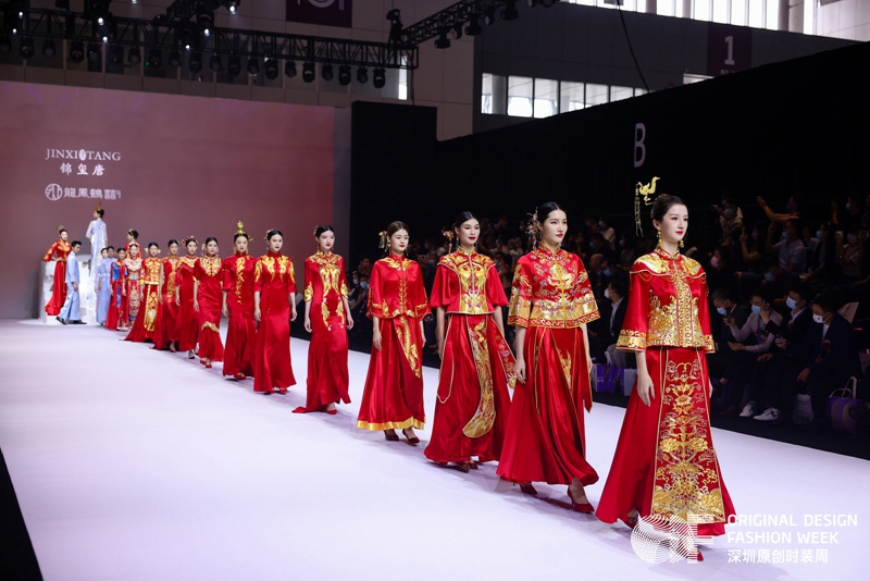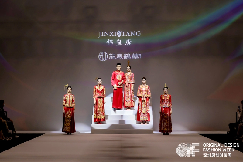 锦玺唐•龍鳯鹤囍带来的“流光溢彩 锦绣未央”主题大秀,以古典且震撼的东方美学为开场,缓缓拉开时装周的帷幕。作为致力于传承非遗文化的深圳本土品牌,锦玺唐•龍鳯鹤囍呈现了极为经典的东方审美。