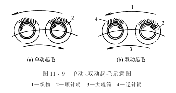 单动式起毛机针辊转动方向与起毛辊筒转动方向相反,针尖指向一致,且与织物运行方向相同,如图11-9(a)所示。调节针辊转速,可获得不同的起毛效果。