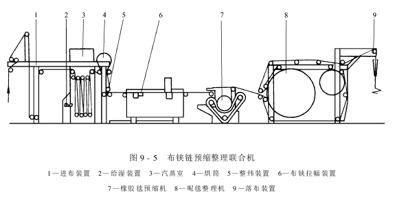 (2)布铗链预缩整理联合机:如图9-5所示,全机由进出布装置、汽蒸给湿装置、短布铗拉幅装置、三辊橡胶毯预缩机及呢毯烘干部分组成。进出布装置由张力器、吸边器、喂入辊及布速测定仪组成。给湿采用喷雾和汽蒸箱,以提高渗透吸湿效果。短布铗拉幅装置使织物平整无折皱地进入三辊胶毯预缩机,并能依据工艺需要调整织物的喂入速度和经、纬向张力。预缩装置是预缩机的核心部件,由进布、加热承压辊、橡胶毯、加压辊、橡胶毯导辊及张力调节器、橡胶毯冷却等装置组成。呢毯烘干机的作用是对经三辊橡胶毯预缩的织物进行烘干定形,以保证织物的缩水稳定性,并能改善织物的手感和光泽。