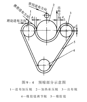 如图9-2所示,在进行机械预缩整理时,橡胶毯随导辊而运行,伸长、压缩不断变换。进布时将织物紧贴在橡胶毯伸长部位a处。当橡胶毯围绕于给布辊时,外侧表面伸长,内表面缩短即a>b>c,运转至加热承压辊后,a段由伸长变化为缩短,b段不变(b为胶毯中部),c段发生伸长,这时出现a′<b′<c′。由于b=b′,因此a>a′。由于给布辊与加热承压辊之间的压力作用,使橡胶毯受到剧烈压缩而变薄伸长,而运行到S点时,这种挤压作用消失,橡胶毯将向外恢复弹出,产生了向后挤压的作用力F,这个反作用力使得橡胶毯紧压于承压辊,也就将织物紧贴在了橡胶毯上,不能滑动。这样织物的形状将完全按橡胶毯变形,进入压缩区域,橡胶毯压缩,织物也随其压缩即发生收缩,从而达到了预缩的目的。当橡胶毯离开承压辊时,织物必须立即离开橡胶毯。因此橡胶毯在后面的导辊上又呈拉伸状态,如织物不及时离开橡胶毯将又会被拉伸而消除预缩效果。织物上的水分和加热作用增加纤维的可塑性,提高了织物的预缩效果。
