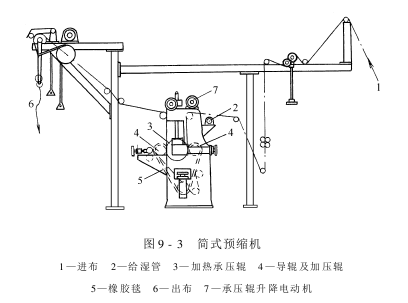 (1)简式三辊橡胶毯预缩机:如图9-3所示,它由进出布装置、给湿装置及三辊橡胶毯预缩装置组成。其核心机构是三辊橡胶毯预缩装置,如图9-4所示,它由橡胶毯、加热承压辊、加压导辊及橡胶毯调节装置等组成,承压辊用蒸汽加热,给湿采用水管喷雾给湿。