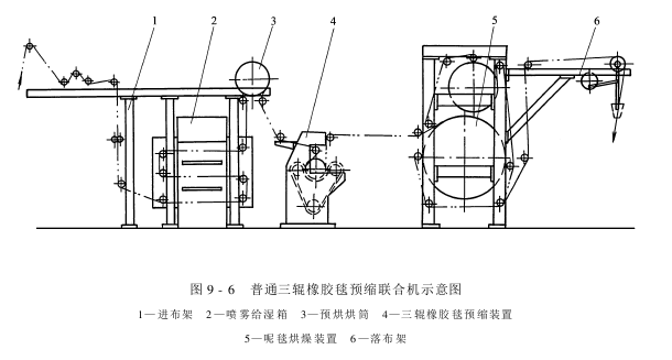 (3)普通三辊橡胶毯预缩联合机:结构如图9-6所示。它与布铁链预缩联合机相比,只是少了一个短布铗链拉幅装置,给湿部分采用给湿箱给湿,给湿箱内装有喷汽管和喷雾管,织物可双面喷雾给湿,也能喷雾与蒸汽加热同时进行,以提高织物的渗透给湿率。