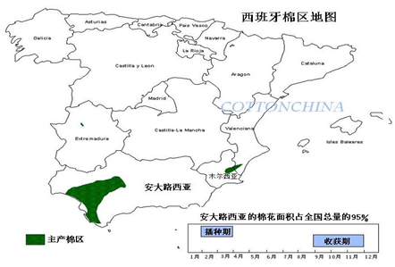 棉花生产集中在安达卢西亚地区,这里约占全国棉花种植面积的95%.