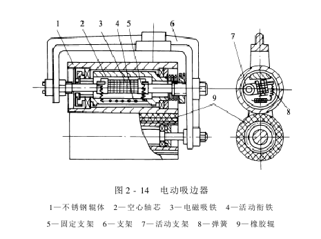图2-14所示的是目前国内使用广泛的一种电动吸边器。它的一对压辊由一只不锈钢辊和一只橡胶辊组成。在不锈钢辊内装有固定的电磁吸铁和活动衔铁。吸铁与衔铁间装有弹簧,固定吸铁安装在支架上,活动衔铁与不锈钢辊体相连。当织物正常运行时,两辊间由吸铁弹簧加压,平幅织物两边的吸边力相等。当织物偏移时,即碰到触杆,通过控制元件,使吸铁工作,克服弹簧压力,使一对压辊脱开释压,织物向另一边回移,从而纠正了偏移。