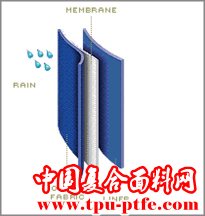 ePTFE是以聚四氟乙烯为原料经膨化拉伸形成的多微孔膜。实验发现PTFE膜表面布满原纤维状微孔,每一平方寸有多达90亿个微孔,截面是一种网络结构,在孔的三维结构上有网状联通、孔镶套、孔道弯曲等非常复杂的结构。水蒸气分子的直径为0.0004微米,而雨水中直径小的轻雾的直径为20微米,毛毛雨的直径已经高达400微米,聚四氟乙烯微孔直径变化范围在0.1-0.5微米,孔隙直径在水蒸气和雨水之间,故为顶级的防水透气材料。复合面料是由膨体聚四氟乙烯薄膜(ePTFE)与涤纶纤维通过特殊工艺覆合而成。