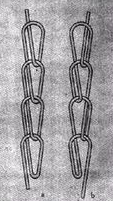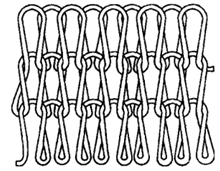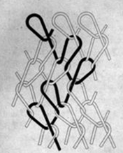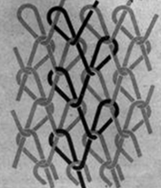 3.编链组织 每根经纱始终绕同一枚针垫纱成圈,形成一根连续的线圈链,分开口编链和闭口编链两类。编链组织结构紧密,纵向延伸性小,不易卷边。一般和其他组织层压织成针织物物物,可以限制织物纵向延伸性和提高尺寸稳定性。