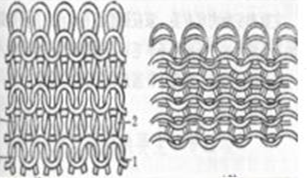 4.双罗纹组织 双罗纹组织又称棉毛组织,是由两个罗纹组织交叉贴合而成,在一个罗纹组织的线圈纵行之间配置另一个罗纹组织的线圈纵行,线圈的反面被相互覆盖。因此,双罗纹组织织物的正反面都具有纬编平针织物物物的正面线圈的形态,呈现纵向条纹,完洁度好。双罗纹组织的延展性和弹性比罗纹组织要小,线圈的脱散性较小。