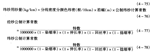 经纱用纱量(kg/km)=分线密度分颜色经纱根数×千米布料经长(m)×公制经纱计算常数