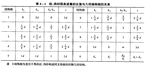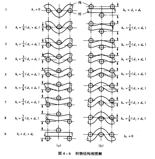 经、纬纱的屈曲波形是在两种极端状态之间变幻的,这种变幻对面料的性能和外观有重要影响。经、纬纱的屈曲波形在这两种极端状态之间可以延续地变幻,可以有无数种屈曲状态。但是为了便于研究与比较,需要设定一些特殊的波形状态。经、纬纱在特定波形时的几何结构状态称为面料的几何结构相,简称结构相。
