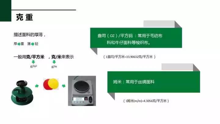 每平方米分量在某种程度上是用来表示一块布料厚度的的参数,比如拉毛的就厚,毛的布料就厚,多层组织的就厚等。通常我们分析一块布料时,布料样惟独很小的一块,就先称出织物的重然后除以他的面积。