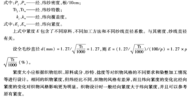 布料的紧度表示面料的密切程度。它表示布料中纺纱线投影面积和其对应的面料面积的百分率。经纱的投影面积所覆盖的百分率称经紧度(经覆盖率),纬纱投影面积所覆盖的百分率称纬紧度(纬覆盖率)。
