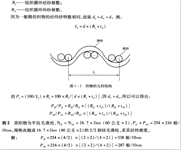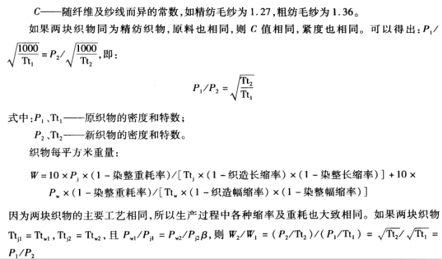 在产品设计时,假如设计人员能够从已收集到的优良产品中寻到相似的布料,就可以用上述的相似面料的计算办法来解决。但是有时需要设计的新产品寻不到相似的布料,这时可利用面料的几何结构估算出新面料的近似密度,作为正式设计时的参考。