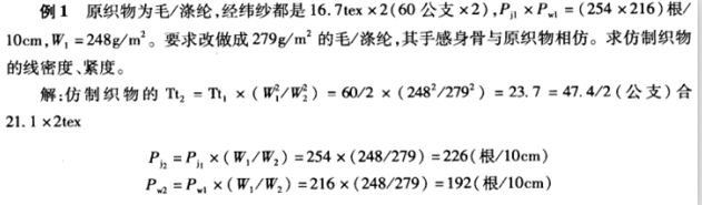 所谓相似布料就是指两块布料的品种相同,手感身骨相仿,而要求更改布料的分量。这样,两块布料的原材料相同,主要工艺也相同,即可根据原布料的数据计算新面料的纱特和密度。