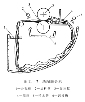 洗缩联合机是洗呢机和缩呢机的有机结合,可同时达到既缩呢又洗呢的目的。结构如图11-7所示。在洗呢机的上、下轧辊前后加装缩幅板与缩箱即成为洗缩联合机。