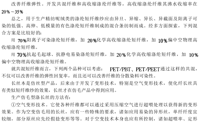 做到化学纤维仿毛,原材料选择和开辟至关重要。早年的不对称凝固、层压纺丝等技术,就是为仿毛所开辟的技术;随着变形技术,特别是空气变形技术的引用,化学纤维长丝仿毛也已进人生产领域。但目前仍以化学纤维短纤为主要仿毛原材料.