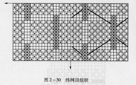 图2-29中右半部的粗黑线表示布料的外观效应,构成的办法和经网目组织相似,只需将经、纬互换方向即可。