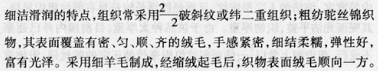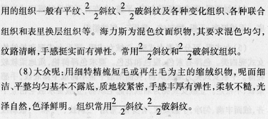 (9)其他:粗纺产品中的其他品种,常见的有劳动呢、粗服呢等,原材料主要用粗短毛、下脚毛、再生毛及以毛纤维为主并选用一部分四级毛的低档产品。粗服呢是棉经、毛纬或混纺化纤织物的缩绒布料。呢面半露底纹,质地密切。劳动呢其经纬都用混纺化纤织物毛纱,呢面半露或露底纹,质地密切,手感厚实。粗服呢、劳动呢的组织都常采纳2/2斜纹、2/2破斜纹。