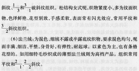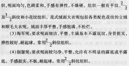 (5)女式呢:可分平素女式呢、站绒女式呢、顺毛女式呢与松结构女式呢四类。色泽有素色、混色与花色。要求色泽明艳,质地柔软较轻薄。平素女式呢为缩绒布料,呢面细洁平坦不露或半露底纹,手感柔软、不松烂。站绒女式呢为缩绒后起毛布料,站绒要求绒毛密站平